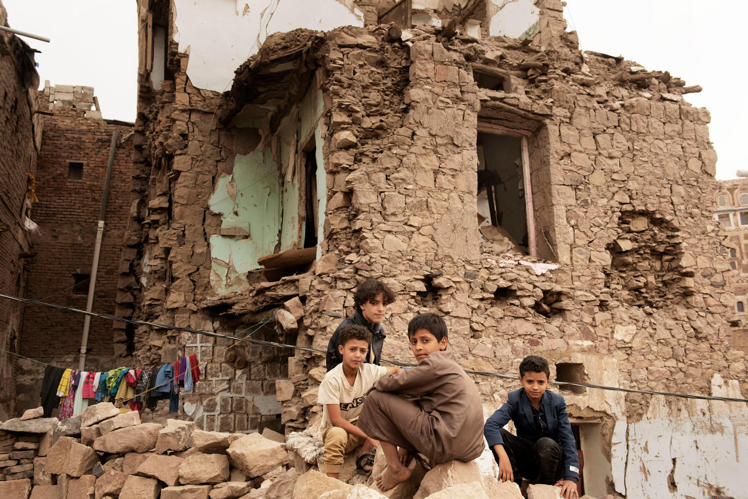 Children sit in front of a house damaged by an air strike, inside the old city of Sana'a, Yemen, on 20 July 2019.
