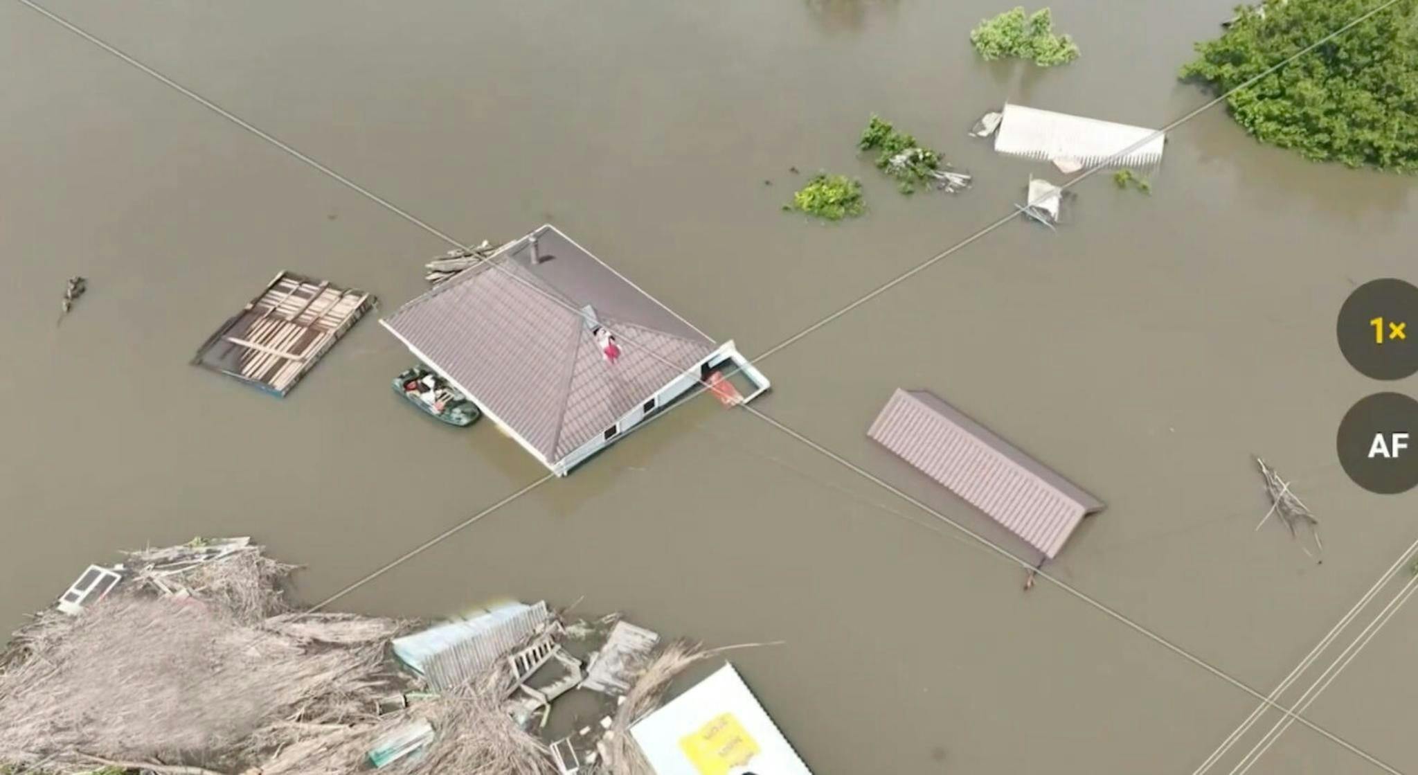 Kateryna and her children waiting for rescue from a roof.