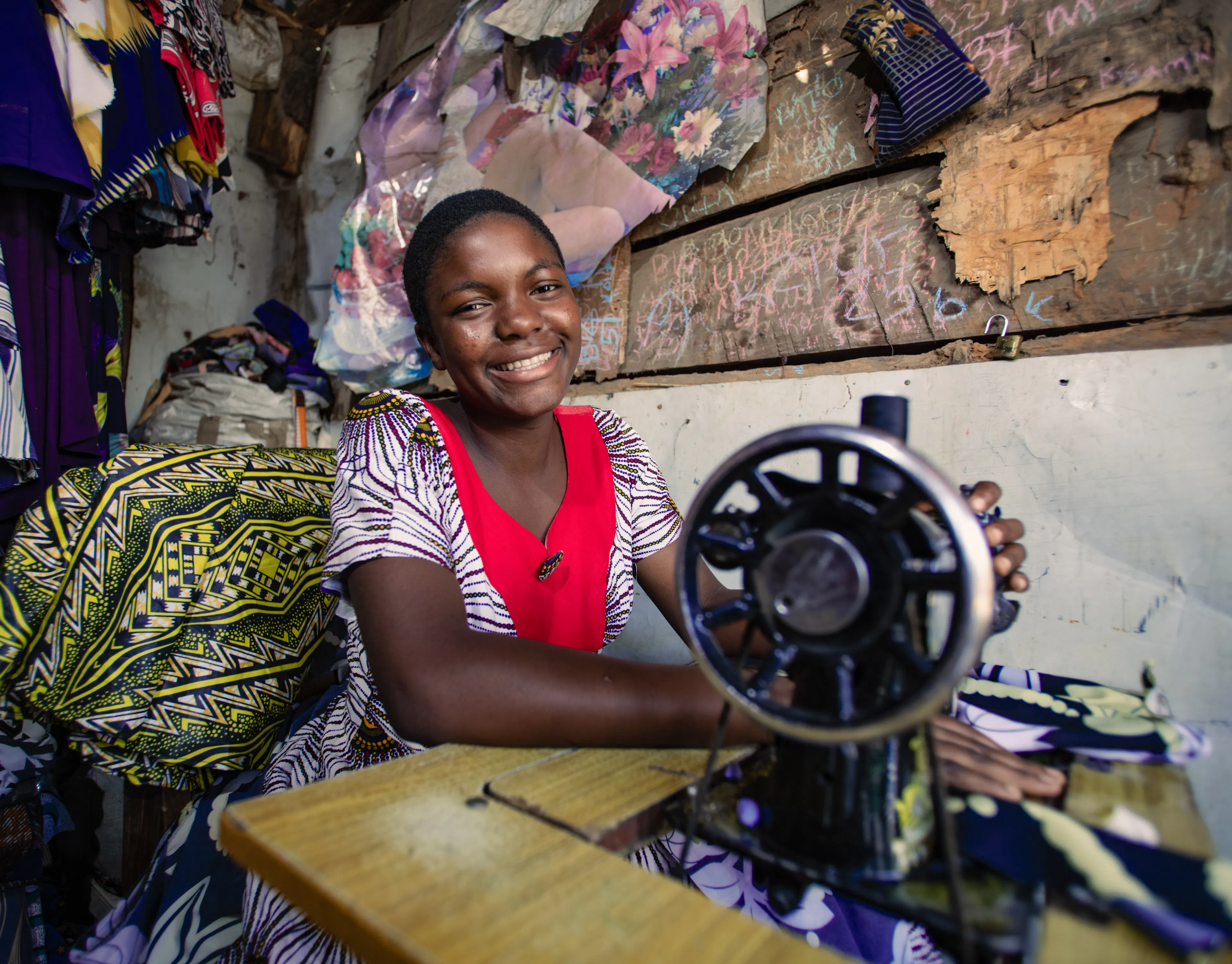 Squeezed into a narrow market stall in Kigoma Region, the United Republic of Tanzania, 17-year-old Antini leans over a sewing machine. A thread held between her lips, she guides the needle with steady hands. Behind her, colourful fabrics and half-finished garments hang like vibrant curtains.
